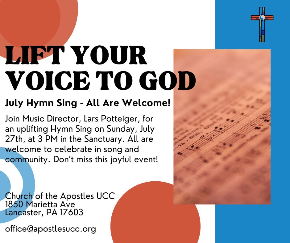 Join Music Director Lars Potteiger on Sunday, July 27th at 3 PM in the Sanctuary for a beautiful afternoon of hymns! All are welcome to come together and raise our voices in song. This is a free event, and we can’t wait to celebrate the joy of music with you!
